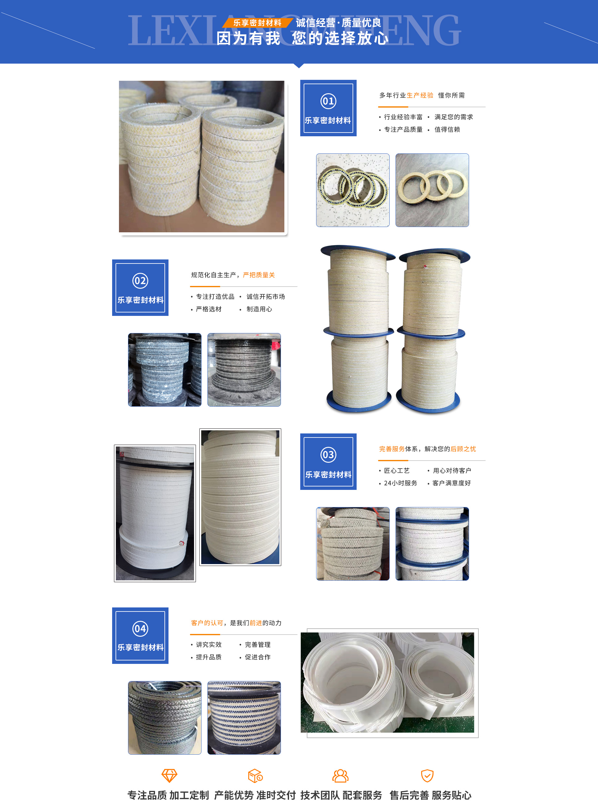 大城縣樂享密封材料有限公司主營:芳綸盤根,四氟盤根,碳素盤根,石棉盤根,芳綸墊片,石棉浸液盤根,芳綸盤根墊片,無油白四氟盤根,含油白四氟盤根,含油黑四氟盤根,石棉含油盤根,芳綸碳素盤根,石棉橡膠盤根,芳綸碳素混編盤根、聚四氟乙烯板(四氟板)等,是生產(chǎn)銷售密封件的廠家,廣泛應用于石油、化工、造紙、造船、發(fā)電、冶金等工業(yè)設備的管道、閥門、法蘭、換熱器等。